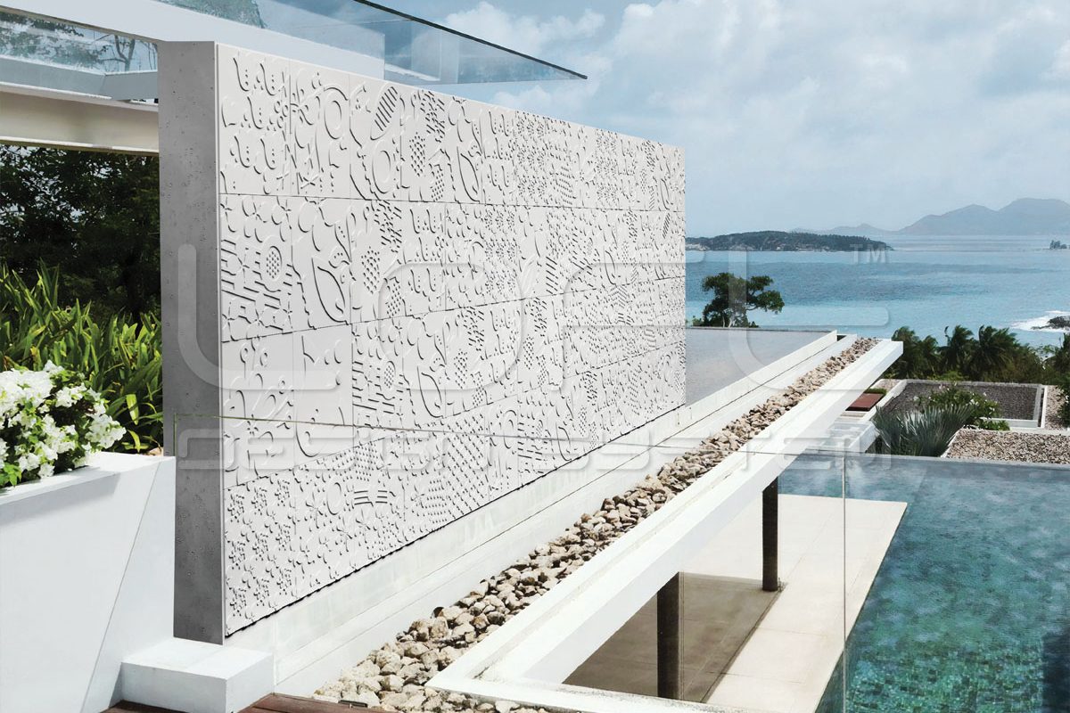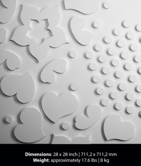 Unikátní vzor z architektonického betonu . Rozměr panelu 711 mm x 711 mm . Tloušťka 12 mm . Hmotnost 8 kg/kus . Možnost výroby ve dvou barevných odstínech světle šedý a tmavě šedý. Objednejte min. 10 kusů panelů různých modelů a vytvořte jedinečný kompozici inspirovanou přírodními a rostlinnými vzormi . Vhodné jak do interiéru tak do exteriéru.